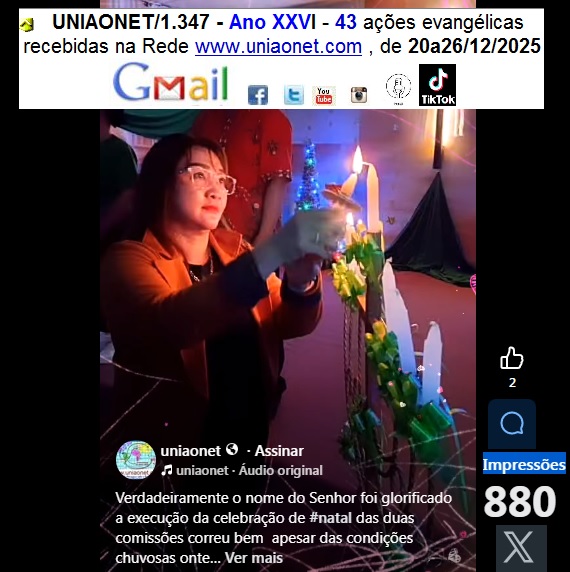 , de 20a26/12/2025O conteúdo integral está disponível no Portal , é de livre reprodução . Caso sua mensagem (ou alguma outra que voce recebe) não conste deste informativo favor nos reenviá-la . Necessitamos de estar em comunhão com o corpo de CRISTO , compartilhe conosco o que Deus tem feito no seu dia a dia , na sua igreja , no seu bairro , cidade ... II